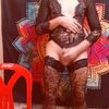 Description: Asian ladyboy with cigarette pumps her shaved cock on the stool part 2